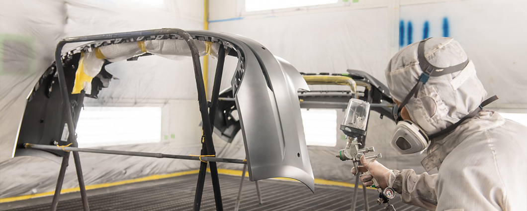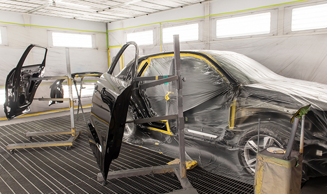 ボディペイントを行うフロアに、鈑金修理を終えたクルマが運び込まれ、補修または交換したパーツに塗装が施されるのだ。フロア内にはペイントブースが2つあり、この日は一方で塗装作業が、もう一方では塗装後の乾燥作業が行われていた。