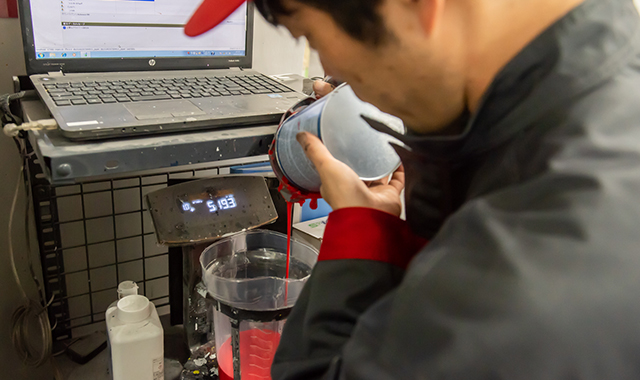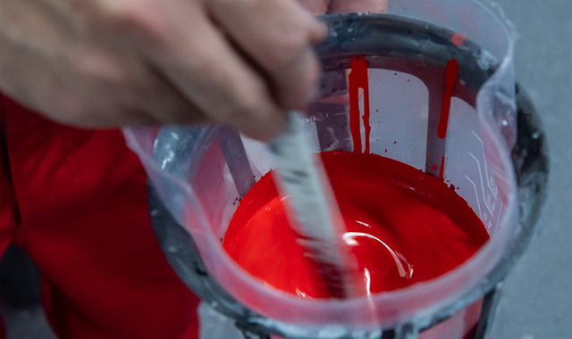 この日は初代Audi TT がフロントフェンダーとバンパーの修理で入庫していた。ボディカラーは“ブリリアントレッド”。さっそくスタッフが“調色”を始める。PCでボディカラーを指定すると、必要な塗料とその配合が表示される。今回はレッド、バイオレッド、ホワイトを使う。ただ、表示されたとおりに色をつくったところで、それが正解ではない。クルマのボディは経年劣化や、保管場所の状況によって大きく異なってくるため、微妙な調整を要する調色が必要となってくる。