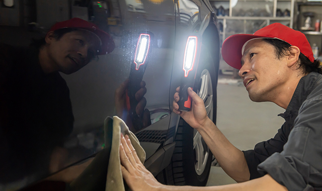 乾燥後は塗装面の歪みや磨き残しがないかを専用のライトを使って入念に確認。ここで合格してはじめて作業が完了となる。修理した部分がわからないほどに美しく仕上がっており、このクルマのオーナーもきっと満足するに違いない。