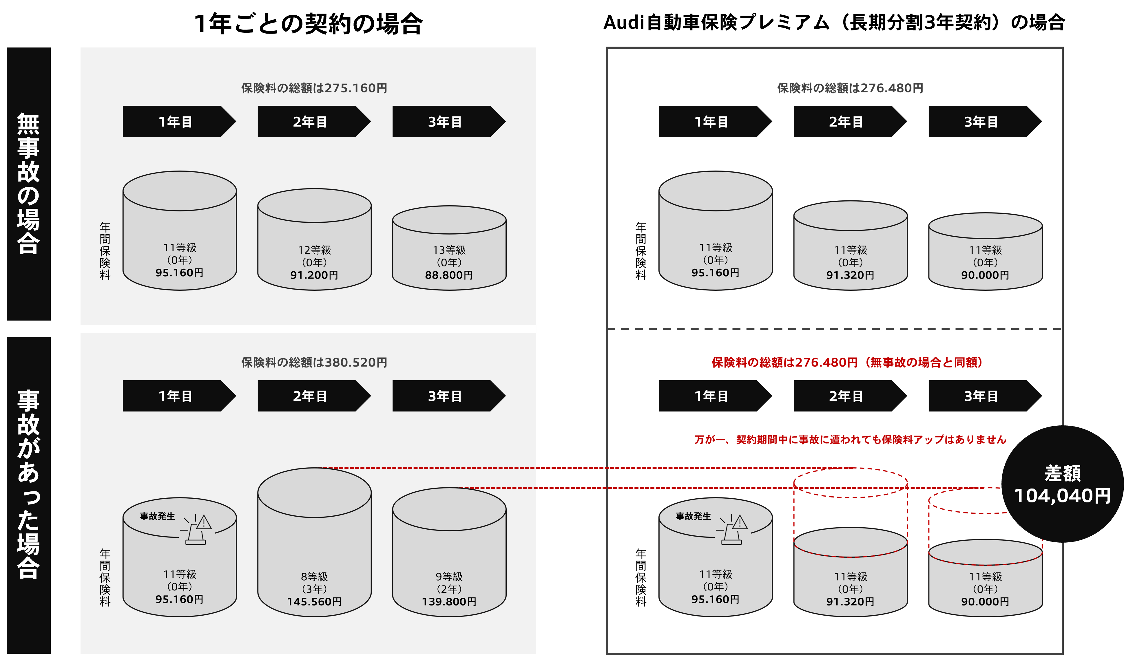 - 当ページは、Audi自動車保険プレミアムの対象である自動車保険の長期分割払契約をご説明するものですが、実際の保険取扱(募集)は最寄のAudi正規ディーラーが保険代理店となります。詳細はそちらへお問い合わせください。