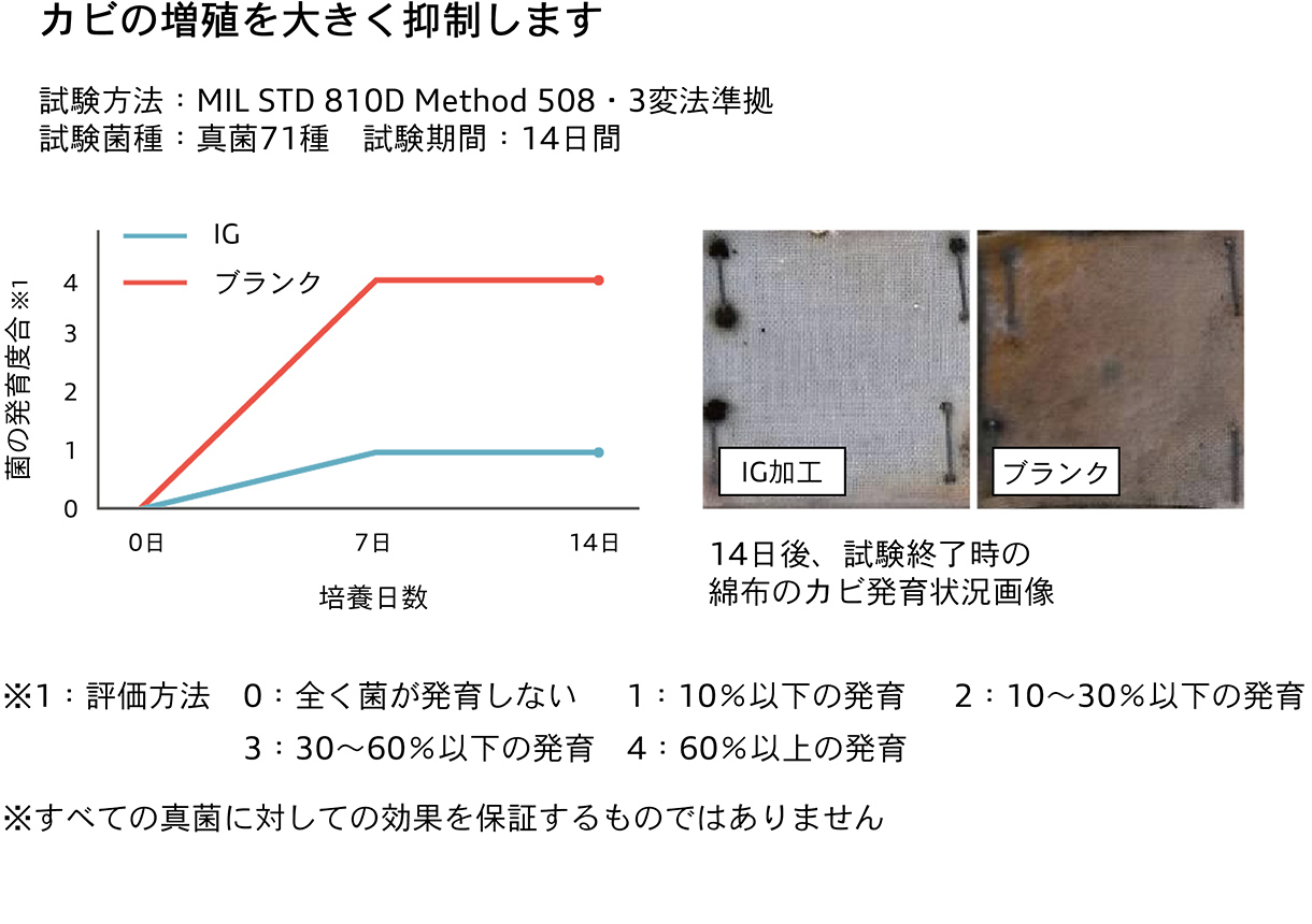 カビの原因となる70種類以上の真菌に対して、長期間に渡り、増殖を抑制します。