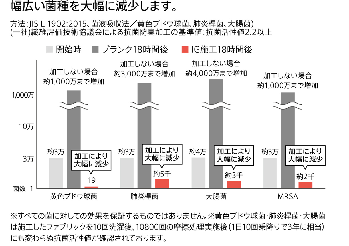 耐性菌であるMRSAや、食中毒の原因になる大腸菌・黄色ブドウ球菌など、幅広い菌種へ効果を発揮します。