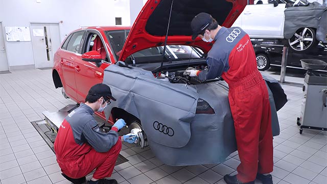 Audi Twin Serviceは通常テクニシャン1人で行う点検作業を2人で行うことで、サービス品質と万全の確認体制をそのままに作業時間を半分にしたスピーディーなサービスをご提供いたします。
