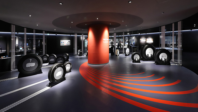 ブリヂストンのこれまでの歩みやDNA、事業活動、さらに未来に向けた活動などを展示中。