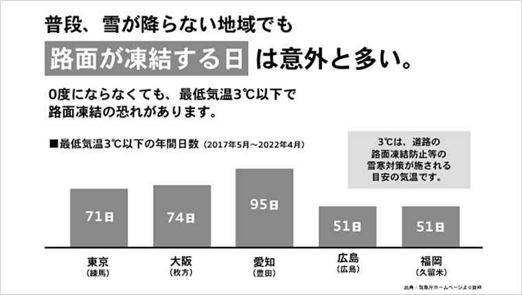 日本の道路は季節、エリアによってさまざまに変化します。特に冬の路面はドライ、ウェット、スノー、アイスと変化が激しいのが特徴です。