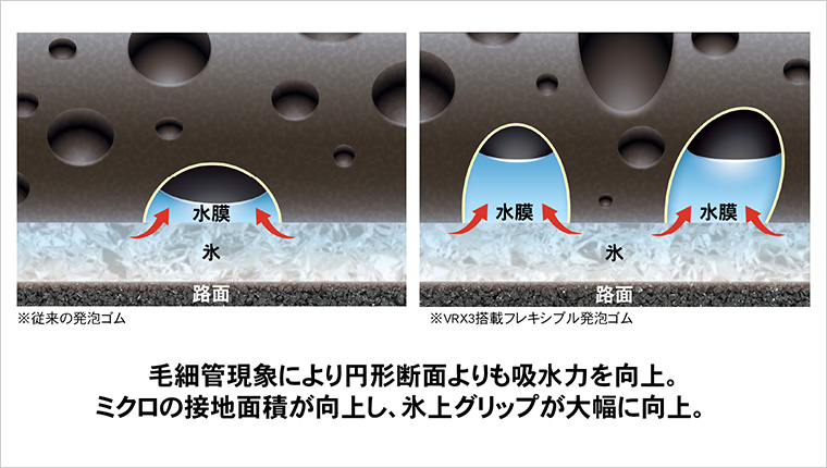 BLIZZAK VRX3の最大の特徴は、従来のスタッドレスタイヤと比べて「氷上性能が120%に向上」したこと、つまり凍結した路面でしっかり止まる、そしてしっかり曲がるということです。氷上でタイヤが滑りやすいのは、氷の表面がタイヤとの摩擦や圧力でわずかに溶け、水の膜が発生するからです。たとえばご家庭で冷凍庫から氷を取り出したとき、表面に霜がついた状態の氷を手で触ると指にくっつきますが、表面が溶け始め光沢がある状態ではツルツルと滑るのはご経験があると思います。これと同じことが凍結路面とタイヤとの間で起こっているわけです。