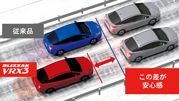 BLIZZAK VRX3は、従来のスタッドレスタイヤに比べて「効きが長持ち」し、さらに「摩耗しにくく経済的」になった画期的なタイヤです。