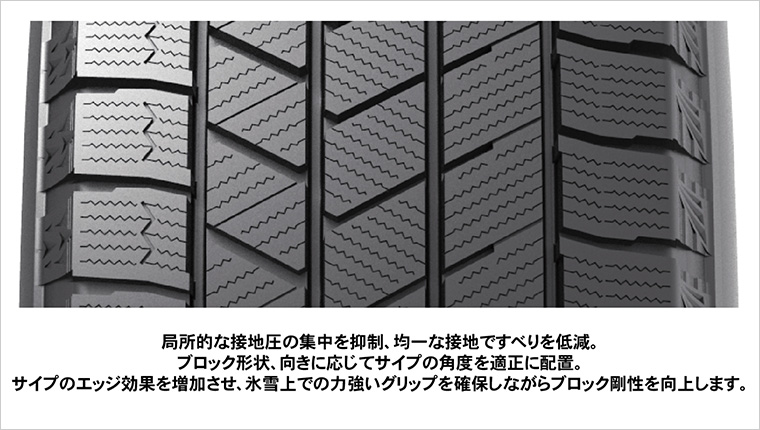 また、先ほど申し上げたサイプの位置や角度を調整することによってタイヤのブロックパターンをなるべく同じ大きさや角度にそろえ、接地面全体に均一に荷重がかかることで、力強いグリップと、偏りのない摩耗を実現します。BLIZZAK VRX3は使用開始時から高い氷上・雪上性能を持っていることに加え、4年使用後も性能が落ちにくく、安心・安全なドライブに寄与します。