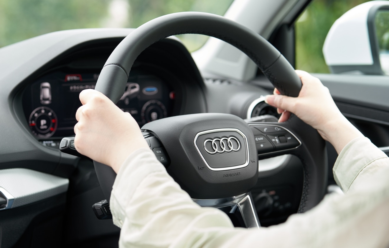 Audiのハンドルは1回転半で一周。曲がりたい方向へハンドルを切れば大きく回すことなくイメージしたカーブを描いてくれます。