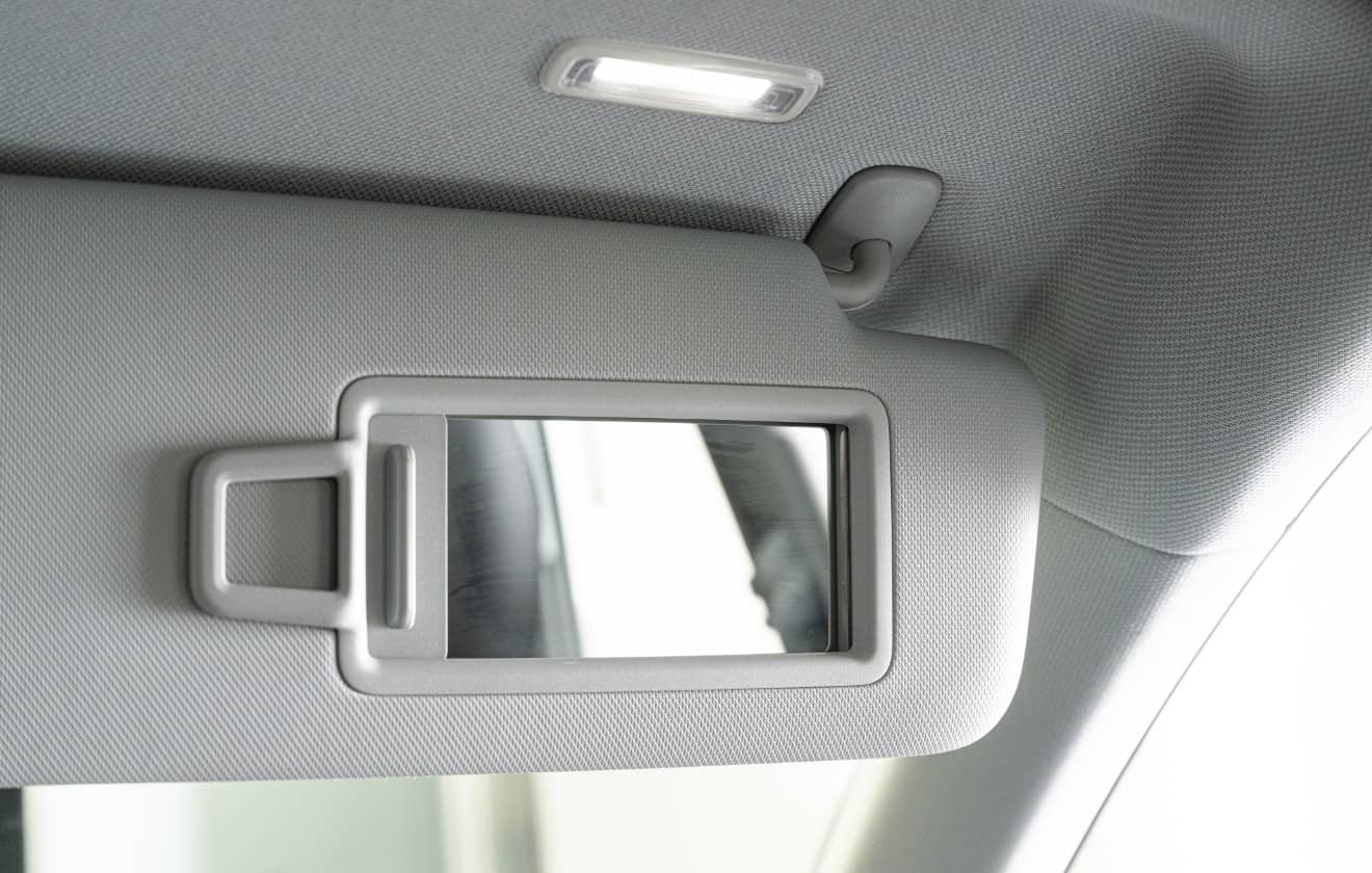 Audiのサンバイザー部分に設置されているバニティミラー。カバーをスライドさせるとライトが点灯するのですが、この光は肌色本来の美しさが見えるよう少し青みのある調整がされています。メイクの仕上がりもチェックでき、女性に特に好評です。
