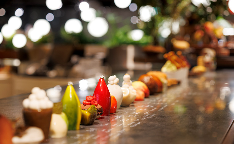 これらのこだわりが、独創的で美しいスイーツを生み出します。丁寧に作られたスイーツは、まさにアート作品のよう。見た目の美しさだけでなく、素材本来の味が織りなす、奥深い味わいも魅力です。サステナビリティとアート。二つの美意識が融合した特別な空間を心ゆくまでご堪能ください。