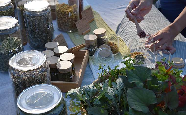 ヨモギ、カキドオシ、クワなどそれぞれの野草が持つ、個性豊かな香りや効能。それらを五感で感じながら、自分好みにブレンドしていきます。