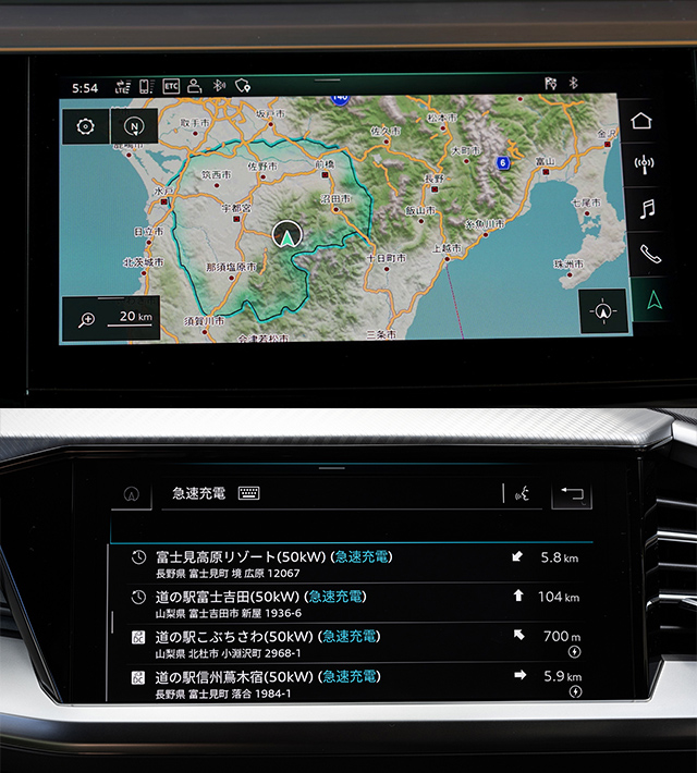 近くの急速充電スポットも検索でき、ナビゲーションで設定した目的地に到達するまでに充電が必要な場合は、休憩を兼ねた急速充電スポットを経由地に含める「e-tronルート」が提案されます。