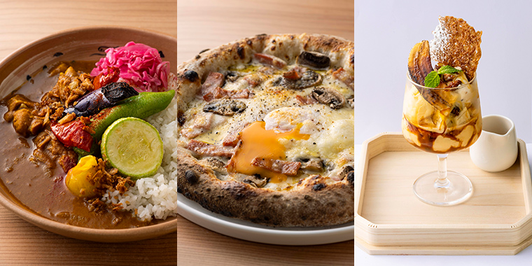 レストランで提供する薪火の窯で焼き上げるピザは、下市近郊で採れた食材を使っています。使用する薪も下市地域のスギやヒノキの間伐材を利用。可能な限り「地産地消」を目指し、この地域ならではの旬の食材の魅力を味わっていただけるメニューを多数用意しております。