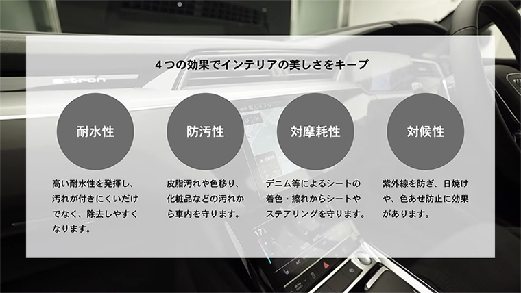 車内のファブリックや革の他、樹脂や金属などあらゆる素材をコーティングして、インテリアを擦れや汚れから保護。シートの柔軟性も失うことなく、長期間コーティング効果を発揮して清潔に保ちます。