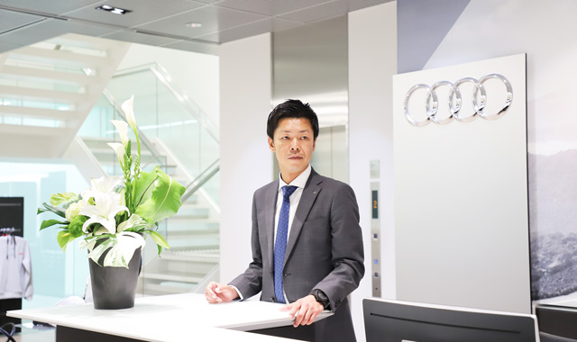 約20年間自動車業界で活躍し、2014年にアウディジャパン販売に入社。現在はセールスマネージャーとしてAudi堺で9人のスタッフを束ねる佐藤。自身が長年セールスとして携わるなかで得た“営業の秘訣”は、いまAudi堺のスタッフにも浸透している。