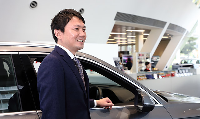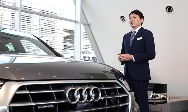 セールスを担当しています。はじめは地方のとあるショールームにいましたが、東京の直営店で働いてみたいと思い、弊社に転職しました。前職とあわせると、約10年間Audiのセールス一筋です。セールスといえば、従来はクルマの性能や走行フィール、デザインなどをアピールする仕事でもありましたが、いま店舗にいらっしゃるお客様の多くは、事前にネットでクルマの情報を調べたうえで実物を見に来られます。つまりご来店いただいた時点でクルマを気に入っておられる場合が多いので、Audiの魅力をお伝えするというよりは、その方やご家族のライフスタイルをAudiがどう彩るかをお話しする感じですね。