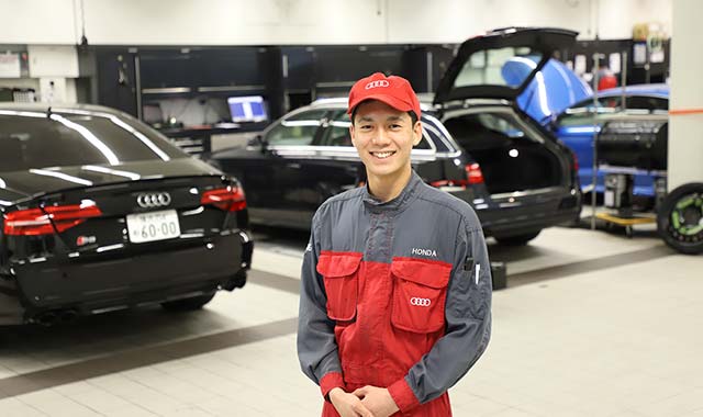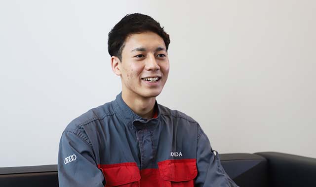 私はもともクルマやバイクが好きだったので、将来は自動車業界で働くために専門学校で自動車整備について学びました。就活の際には、国産車を含め多くの進路が考えられましたが、輸入車ディーラーで魅力的な高級車、最新のテクノロジーに触れたいと思い、なかでも設計思想に共感ができるAudiで、整備工場の設備も充実していた弊社を志望しました。実際に働いてみると、屋内で冷暖房も完備されている工場は作業に集中でき、環境も申し分ありません。