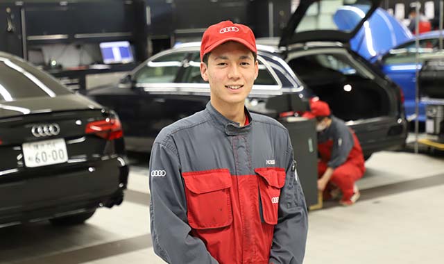 テクニシャンの究極の目標は、お客様の大切なAudiを完璧に整備することだと思います。お客様からすれば、ベテランであろうと新卒であろうと、アウディジャパン販売のテクニシャンには変わりません。やっぱりアウディジャパン販売の整備はどこよりも安心だと思って乗っていただけるように、責任をもって取り組んでいきます。そのうえで、作業の手順や優先順位を考えて手を停めずに作業したり、自分なりの工夫を加えいったりして、整備工場全体の効率アップにも貢献したいと考えています。