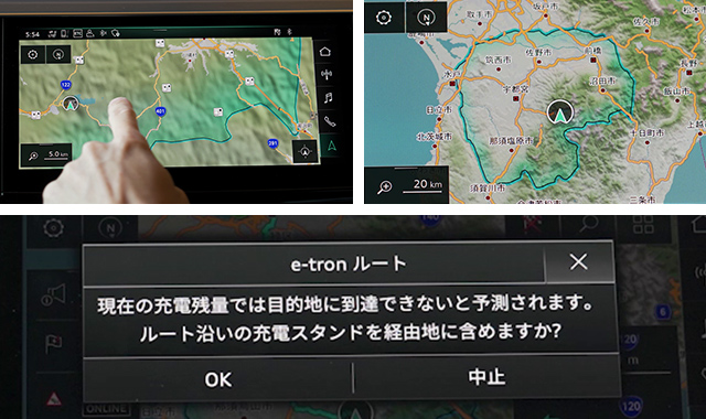 さらにナビゲーションで設定した目的地に到達するまでに充電が必要な場合は、休憩を兼ねた急速充電スポットを経由地に含める「e-tronルート」が提案されるので、長距離でも安心してドライブすることができます。
