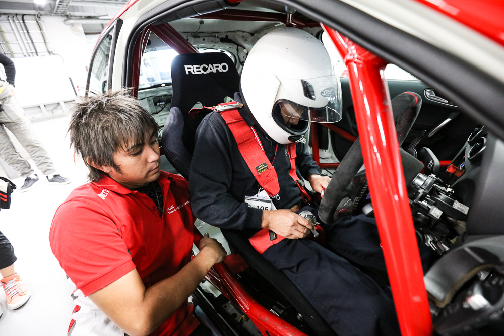 ドライバーミーティングでは、荒聖治選手からフラッグなどのサーキット走行の基本ルールを説明。さらに富士スピードウェイ走行時のアドバイスも行われました。今回のサーキット走行で使用するAudi A1 Fun Cup Carは、富士チャンピオンレースシリーズ「Audi A1 FUN CUP」参戦用マシンで、ライトチューニングや安全装備が装着されている違いはあるものの、基本的には市販されているAudi A1 1.4TSFIと同様。トランスミッションもS tronicなので、ステアリングやブレーキ操作に集中し易いのも特徴です。まずは運転の基本となるベストなドライビングポジションの確認からスタート。Audi A1 Fun Cup Carには、キャビンを守るロールケージ、常に安全かつベストなドライビングポジションを維持するフルバケットシートと6点式シートベルトが装着されているため、乗降時にもコツが必要となります。ドライビングポジションの確認には、荒選手を始め、富田選手、そして、参加者のサポートを務める篠原 拓朗選手がアシストしました。
