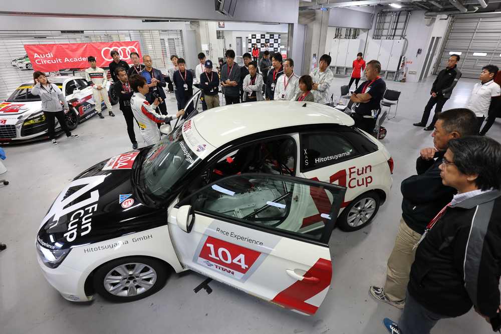 今回は、SUPER GTへAudiで参戦しているTeam Hitotsuyamaの協力のもと、現役レーシングドライバー荒聖治選手を講師に、参加者全員がAudi A1 Fun Cup Carをドライブ。全長4563mのレーシングコースでのレッスン走行及びフリー走行を実施しました。またサーキットならではの特別体験として、富田竜一郎選手がドライブするレーシングカー「Audi RS3 LMS」のホットラップ(助手席同乗体験)も楽しんで頂きました。その模様をお伝えします。
