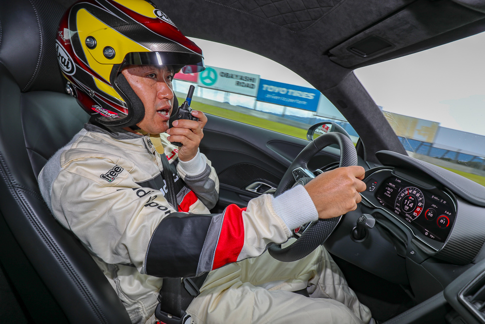 サーキット走行は、20分の練習走行+20分のフリー走行で構成。練習走行では、荒選手がドライブするAudi R8に追従走行を行い、富士スピードウェイサーキットコースのレコードラインと走り方を学びます。レコードラインは、最もタイムが出る走行ラインであると同時に、最も走りやすいラインでもあるので、サーキットを安全かつ速く走るためには、重要なポイント。Audi A1 Fun Cup Carには無線機が搭載されており、前方を走る荒選手からの走行ラインやブレーキポイント、クリッピングポイントなどのコース攻略へのアドバイスが受けられます。当日は、生憎の雨模様で、路面は滑りやすい状態。ドライバーは、より丁寧なドライビングが求められます。しかしながら、ドライビングレッスンでもある同イベントにとっては、このシビアなコンディションも良い経験に繋がります。ウォーミングアップを兼ねた練習走行の後は、フリー走行に。この際、一人での走行が不安な場合、荒選手に先導走行を依頼できるサーキット初心者向けのサポートも。当日は、荒選手の更なる指導を望み、敢えて先導走行を依頼される参加者もいらっしゃいました。