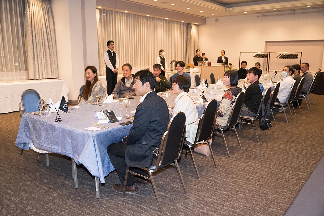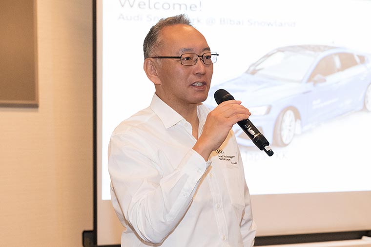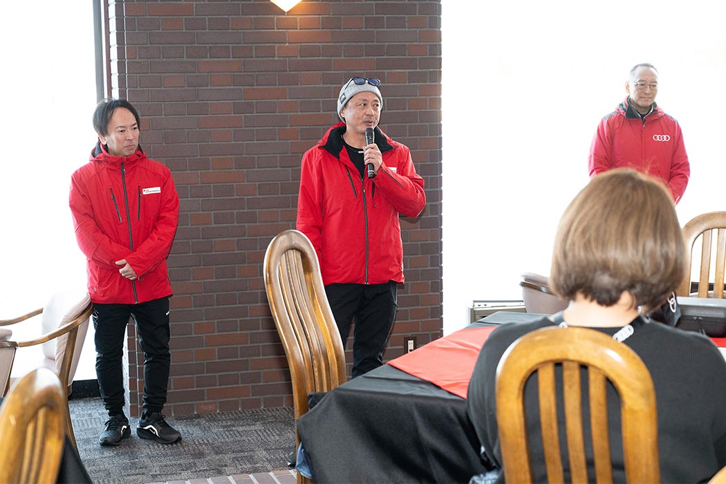 ディナー中はAudi Volkswagen Retail Japan株式会社オペレーション本部ダイレクター 遠藤昭久による挨拶や、ドイツ本国公認のインストラクターより2日目の雪上ドライビングにおけるポイントやドライビング理論をお話しさせていただきました。