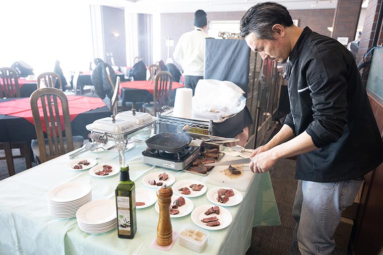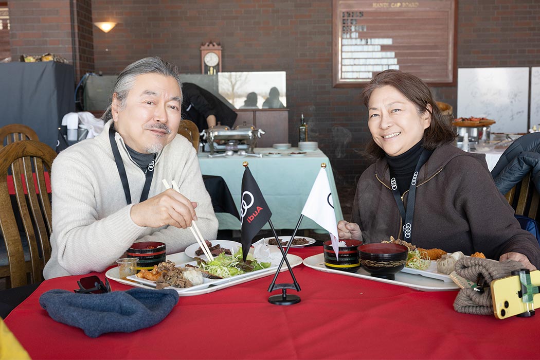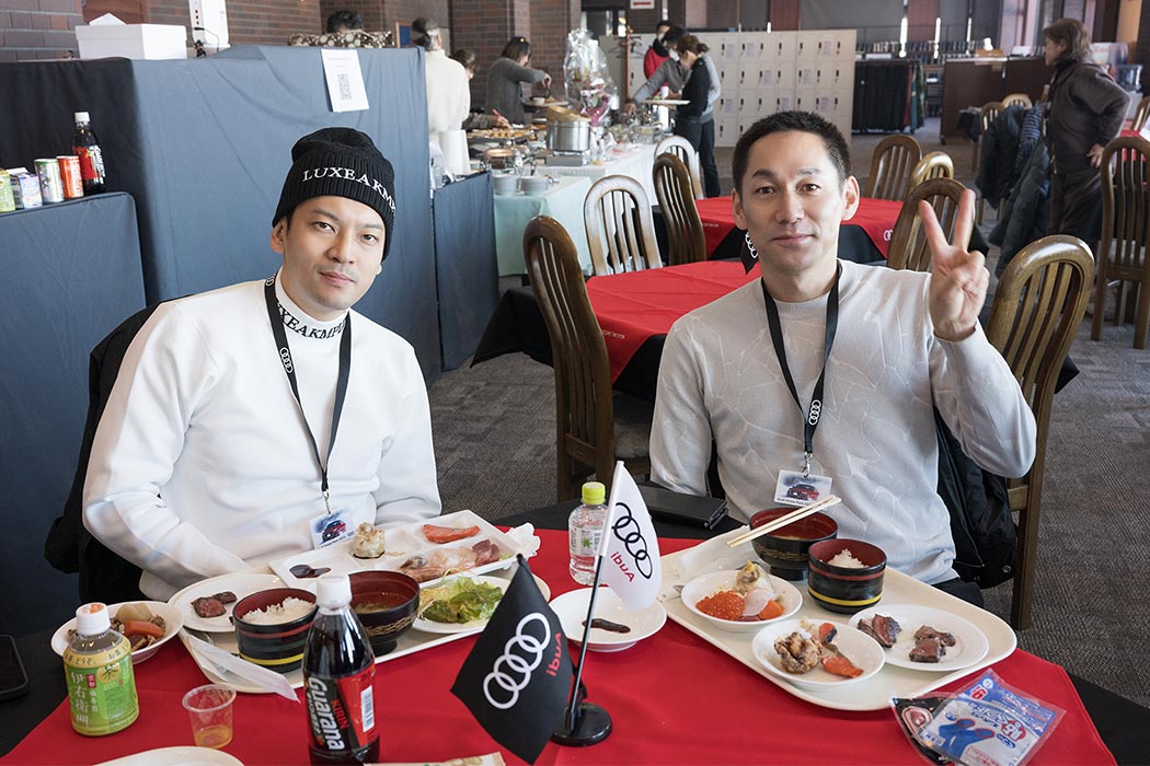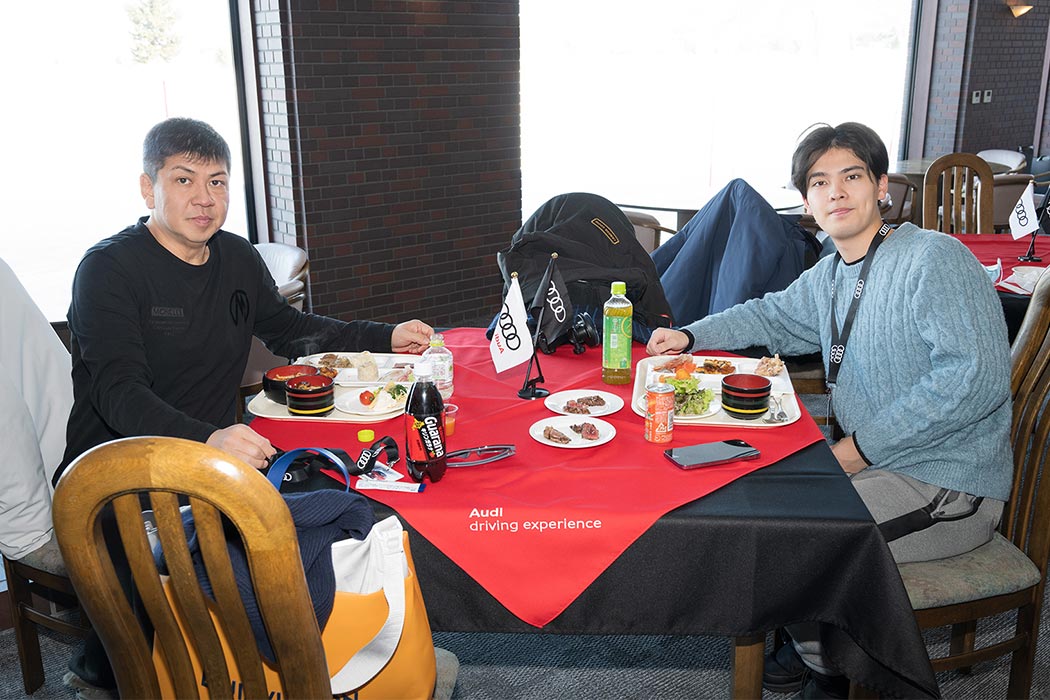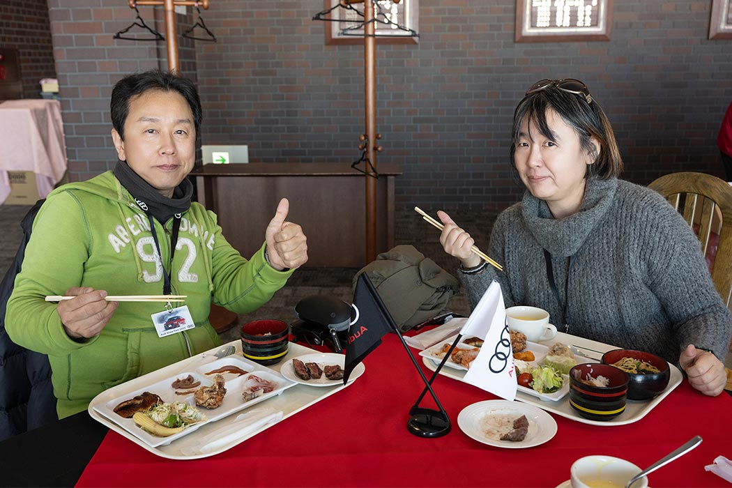 午前のプログラムが終了し、寒さで消耗した体力を回復するためにランチ休憩へ。地元・美唄でお店を営むシェフがその場でエゾ鹿を焼くライブキッチンをはじめ、北海道の海と山の幸を一度に体感いただける料理をブッフェ形式でお召し上がりいただきました。ランチブッフェ後は走行プログラムが再開します。午後は「ステアリングワーク」「スポーティネス」「スノーモービルツアー」の3つのアクティビティを順番に体験いただきました。