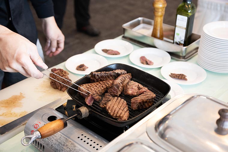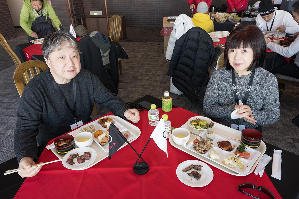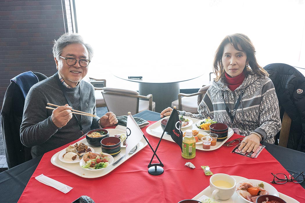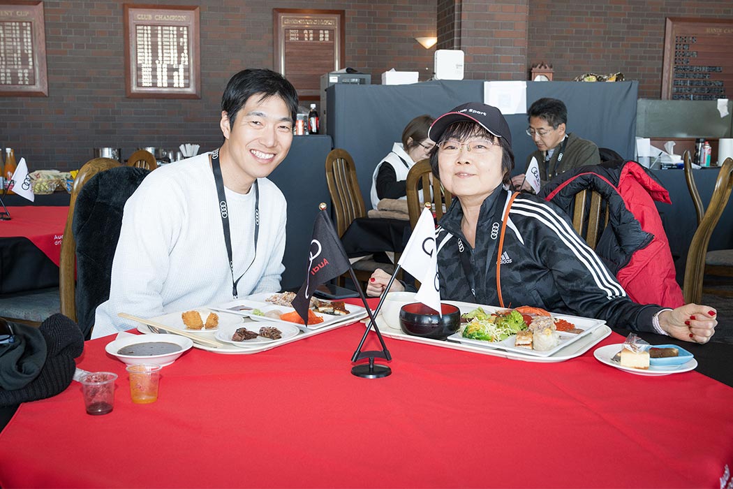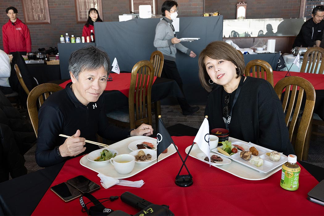 午前のプログラムが終了し、寒さで消耗した体力を回復するためにランチ休憩へ。地元・美唄でお店を営むシェフがその場でエゾ鹿を焼くライブキッチンをはじめ、北海道の海と山の幸を一度に体感いただける料理をブッフェ形式でお召し上がりいただきました。ランチブッフェ後は走行プログラムが再開します。午後は「ステアリングワーク」「スポーティネス」「スノーモービルツアー」の3つのアクティビティを順番に体験いただきました。