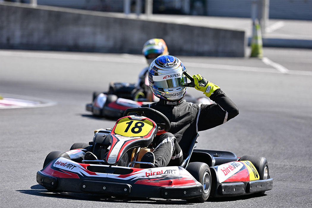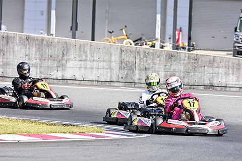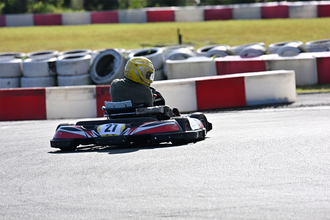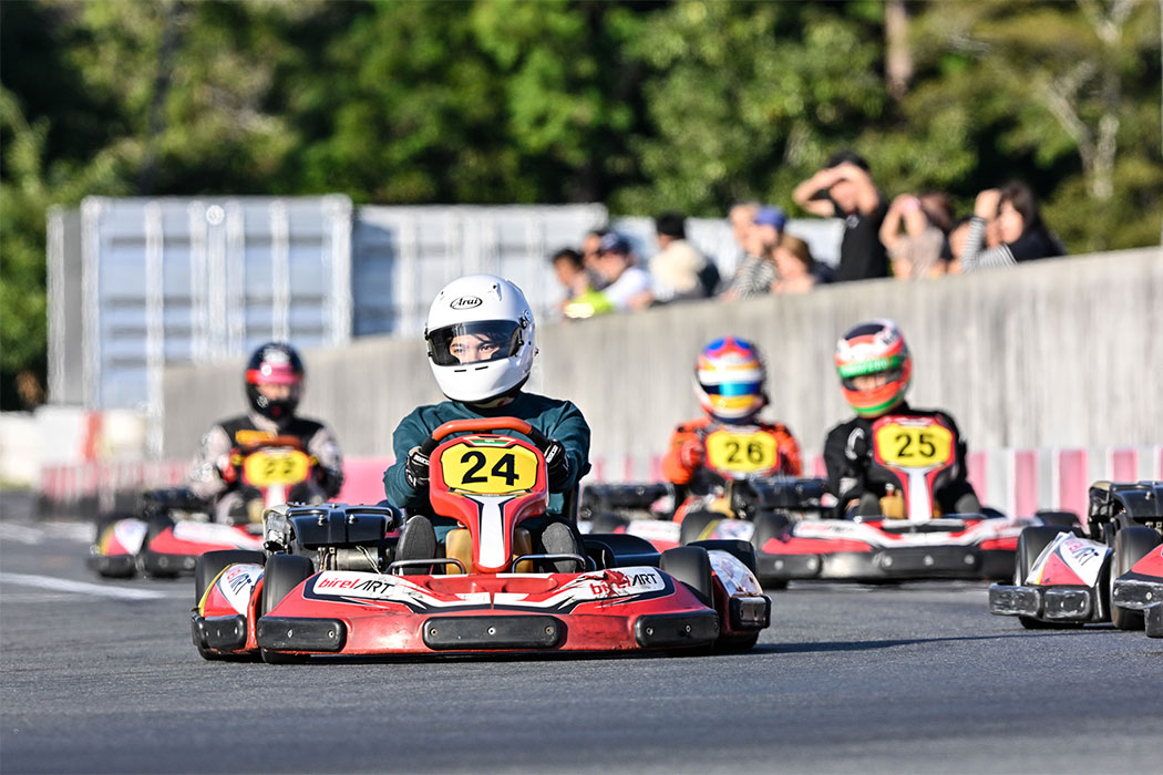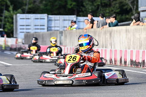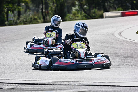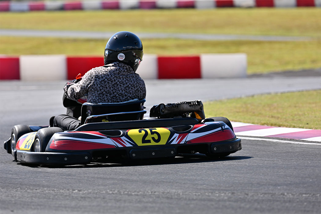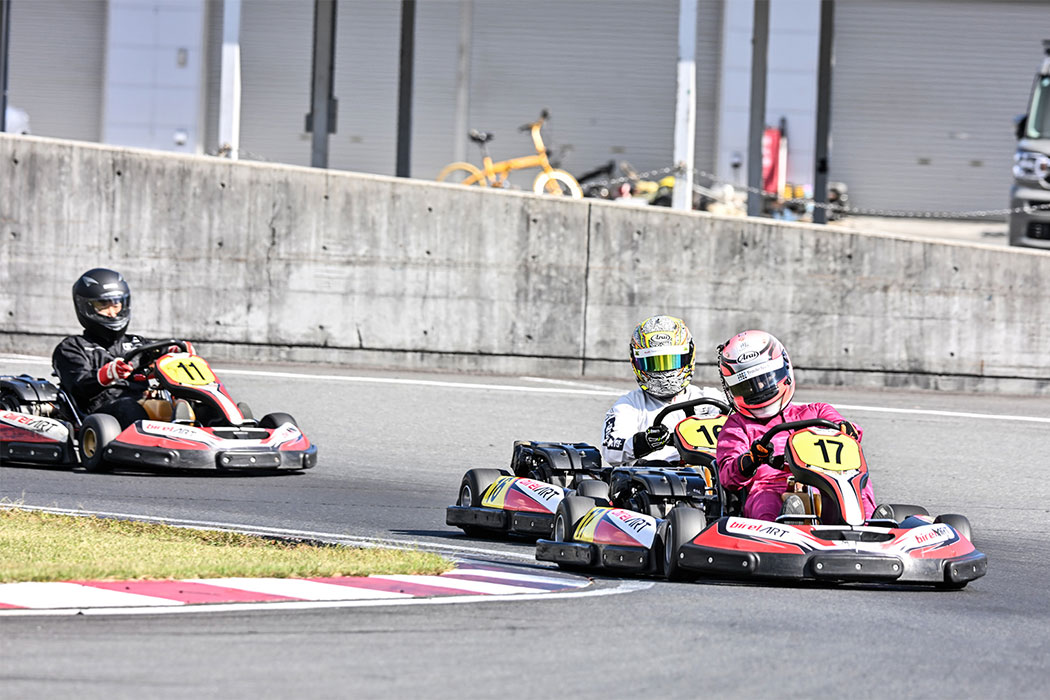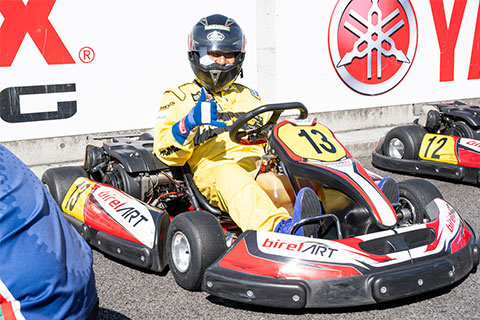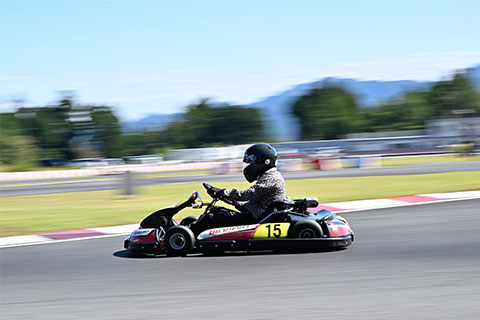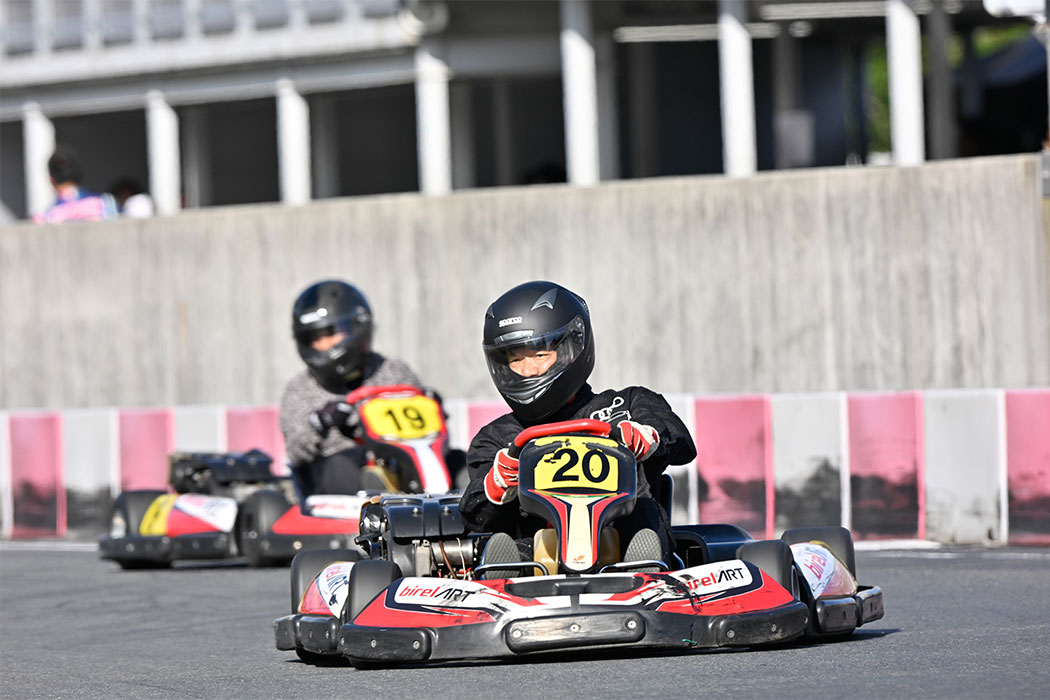 走行がスタートするとレーシングドライバー先導のもとコースインし、コースの理想的な走行ラインを体感いただき、15分間の走行時間で4ストロークエンジンを搭載したレーシングカートならではの挙動を把握し、理想のレコードラインやステアリングワークを探っていただきました。