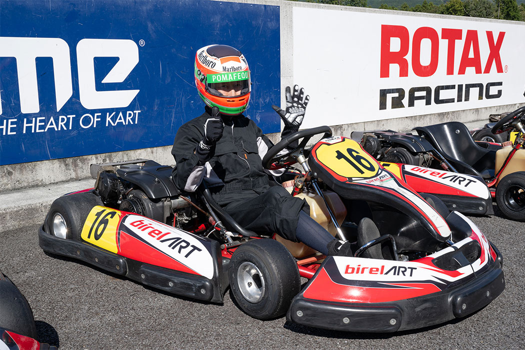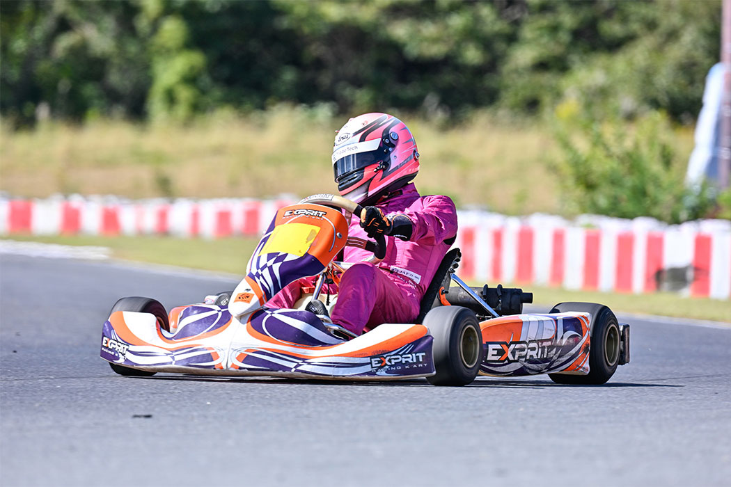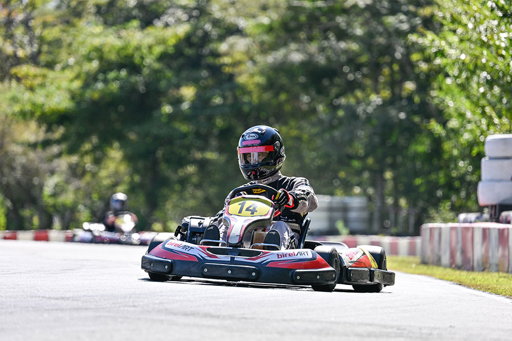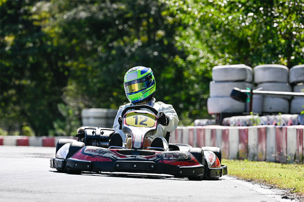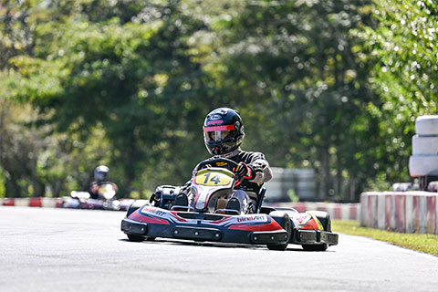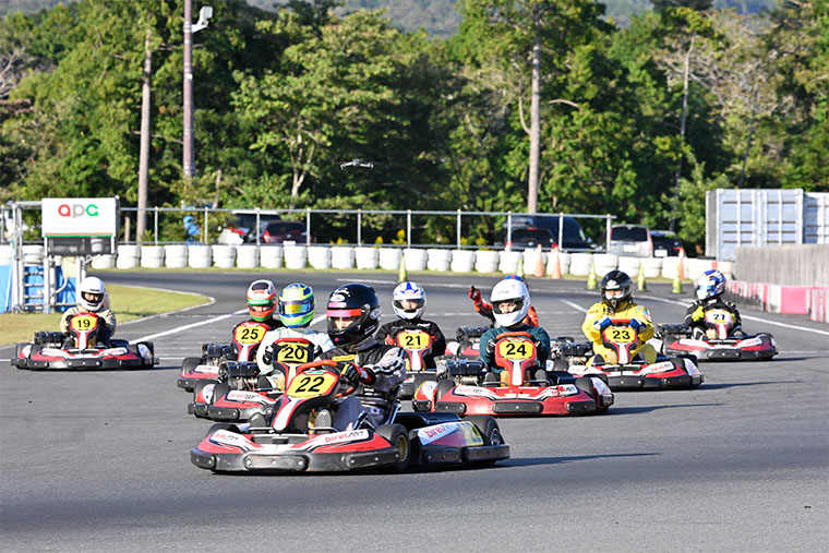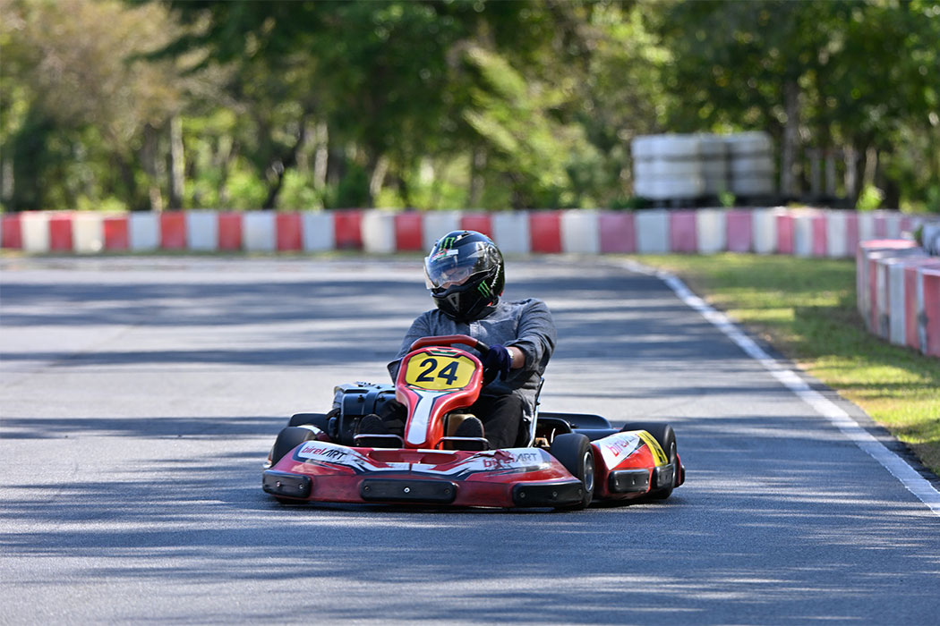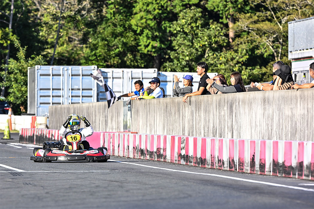 走行がスタートするとレーシングドライバー先導のもとコースインし、コースの理想的な走行ラインを体感いただき、15分間の走行時間で4ストロークエンジンを搭載したレーシングカートならではの挙動を把握し、理想のレコードラインやステアリングワークを探っていただきました。
