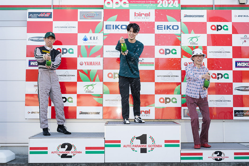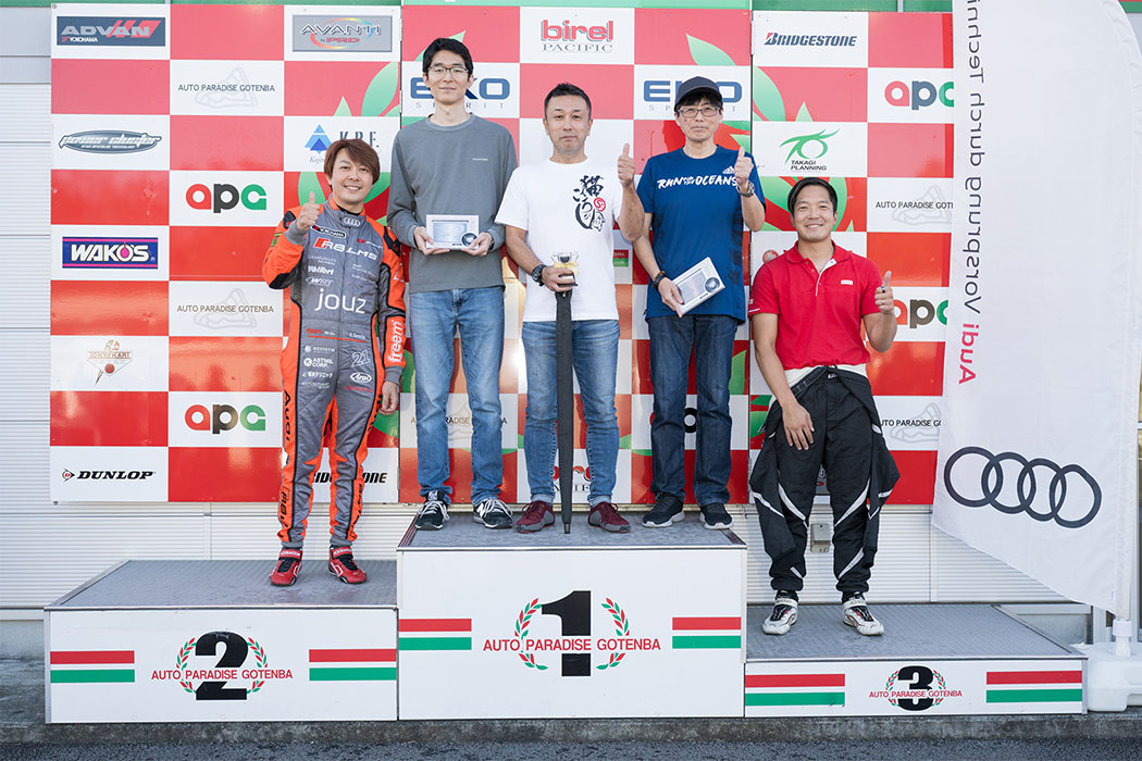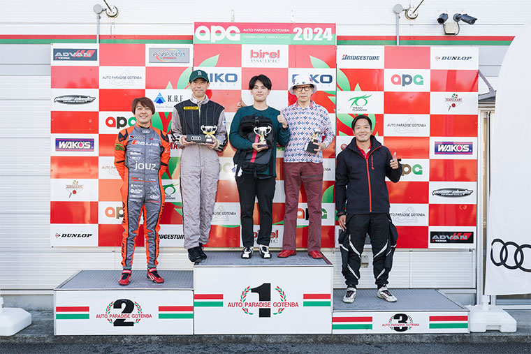 決勝レース上位の方には、トロフィーの授与や景品の贈呈、そして表彰台でのシャンパンファイトが行われ、参加者同士で健闘を讃え合い、「Audi Racing Kart Challenge 2024」を締めくくりました。ご参加の皆様は走りっぱなしの1日に疲れも見えましたが、イベント終了後のお客様は非常にご満足いただいた方が多く、再度開催してほしいとの声も多くいただきました。