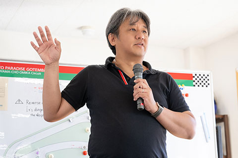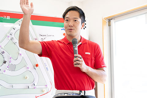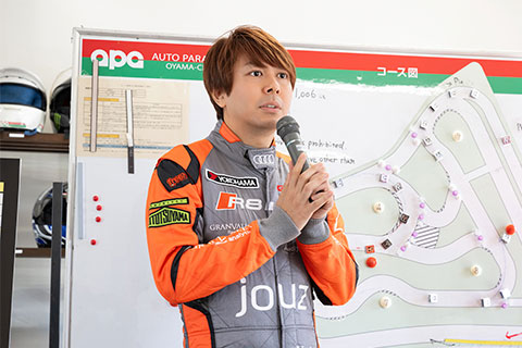 まず初めにインストラクターにはレーシングドライバーの富田竜一郎選手と久保凜太郎選手を招き、カートのレクチャーを行いました。フラッグの説明からカートの乗り方などの基本的な説明後、コースのブレーキングポイントやハンドリングなどをプロならではの目線でお伝えし、ご参加いただいた皆様も集中して聞かれていました。