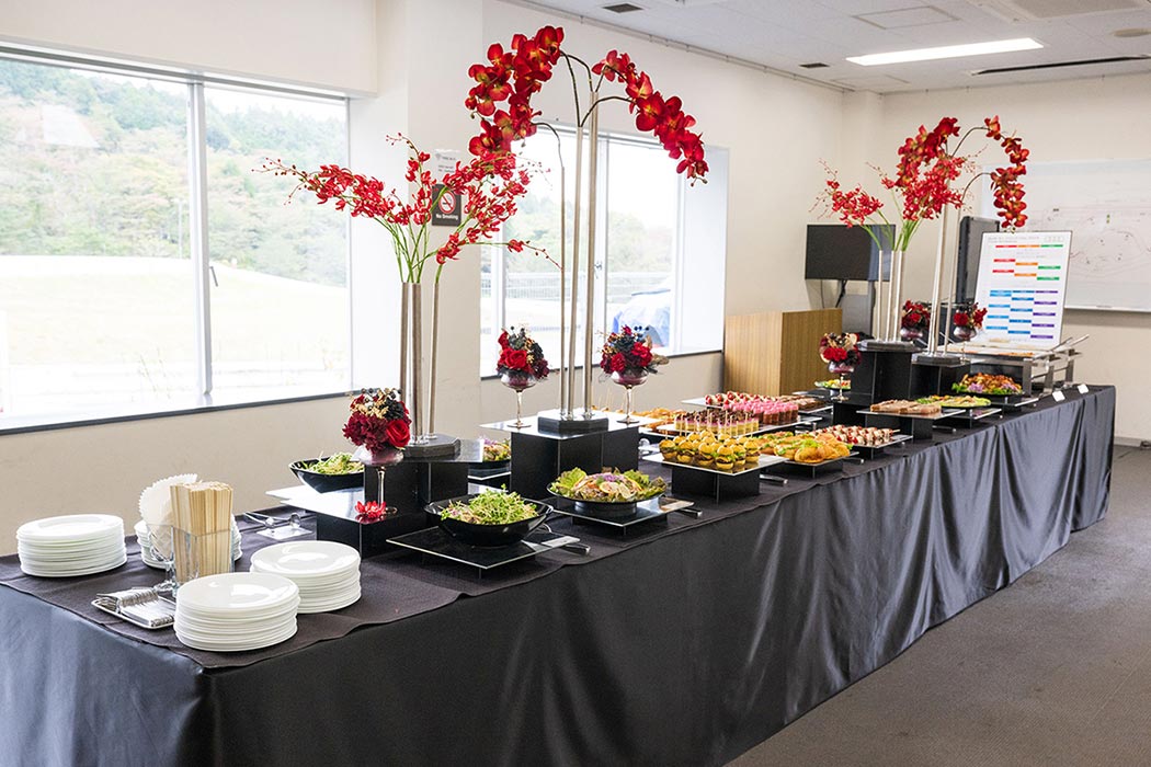 ブレーキングとコーナリングの基礎をしっかりと学んでいただいた後は、12種類のオリジナルメニューのブッフェスタイルのランチをお召し上がりいただき、午後の走行に向けてエネルギー補給をしていただきました。