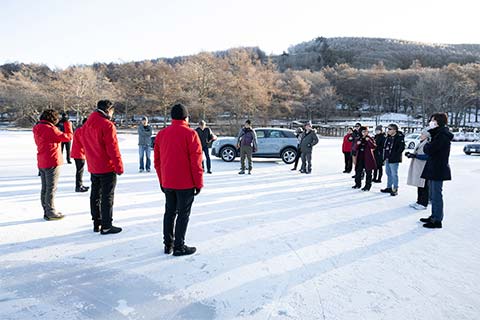 2日目の朝から、いよいよ湖上に設けられた特設コースでのドライビングがはじまりました。今回は、ご自身のAudi車で参加いただくコースと、レンタルモデルで参加いただくコースをご用意しました。3グループに分かれて、ドライビングポジションの確認をしたのちに、氷上でのフルブレーキング体験です。