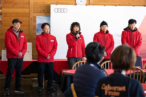 今回のイベントではAudiドイツ本国公認のインストラクター5名を講師に迎えて開催しましたが、夕方からのブリーフィングでは、チーフインストラクターから、滑りやすい路面状態でのアンダーステア、オーバーステアの原因や対処法やタイヤのグリップ力を限界まで発揮するための摩擦円の考え方等、2日目の女神湖でのドライビングエクスペリエンスで体験いただくアクティビティの理論をお話ししました。