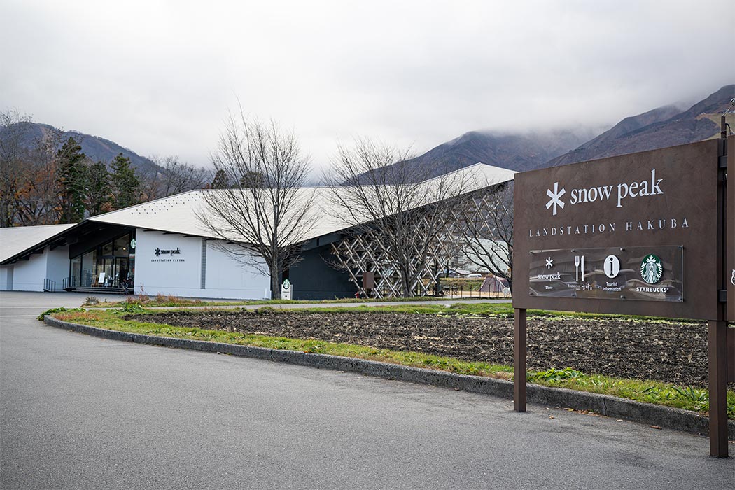 チェックポイントの「スノーピークランドステーション白馬」 は国内最大規模となるスノーピークの直営店。スノーピークのショップのほか、スターバックスや白馬村の観光案内所もあるスポットです。天気がいい日は、芝生のガーデンや森の向こうに雄大な白馬三山の景観を望むことができるのですが……。私たちが訪れた日は残念ながら雲の中、でした。1stグループが訪れた時は好天&絶景だったようなので、写真はご紹介しておきますね。