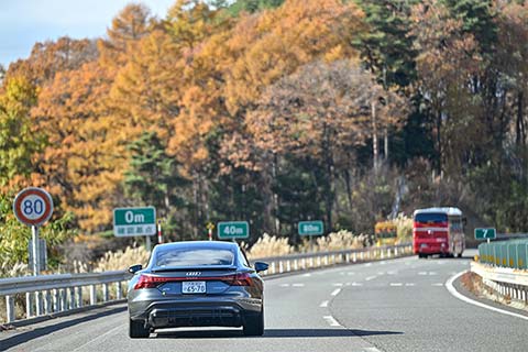 ランチ休憩が終わると、高原のワインディングロードとして名高い八ヶ岳高原ラインを走って小淵沢ICへ。標高が高いところでは少しピークを過ぎてはいましたが、紅葉のワインディングをAudi e-tronで快走するのは、なんとも至福のひとときでした。