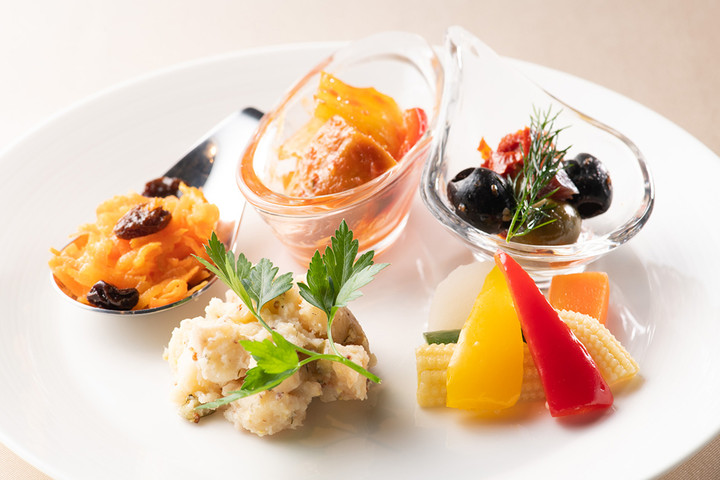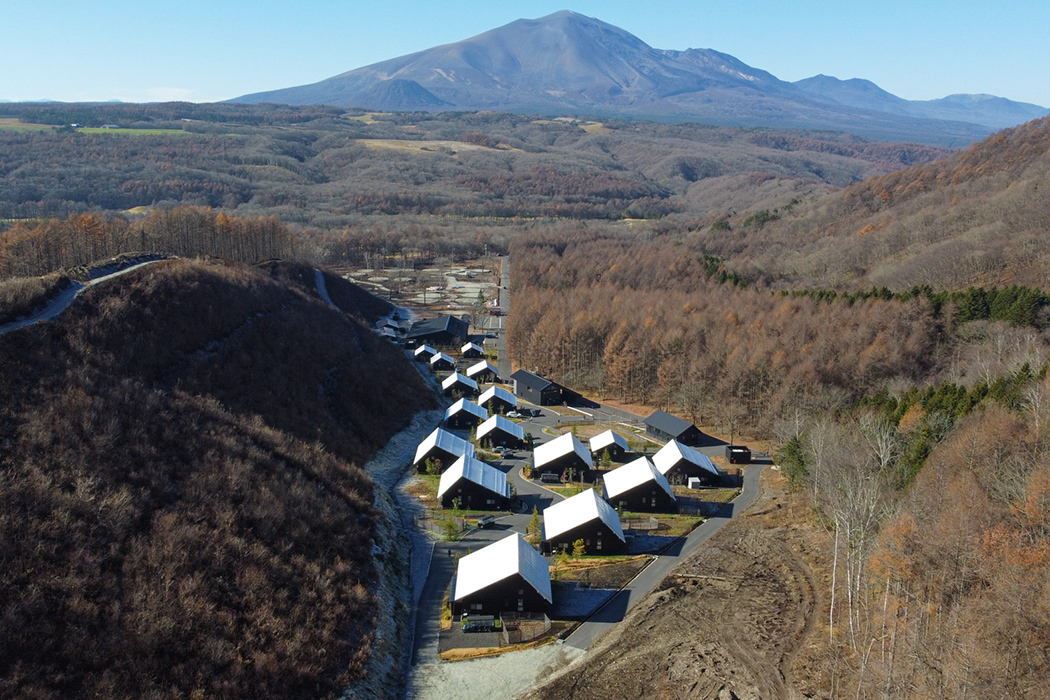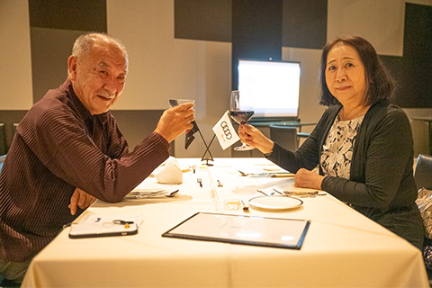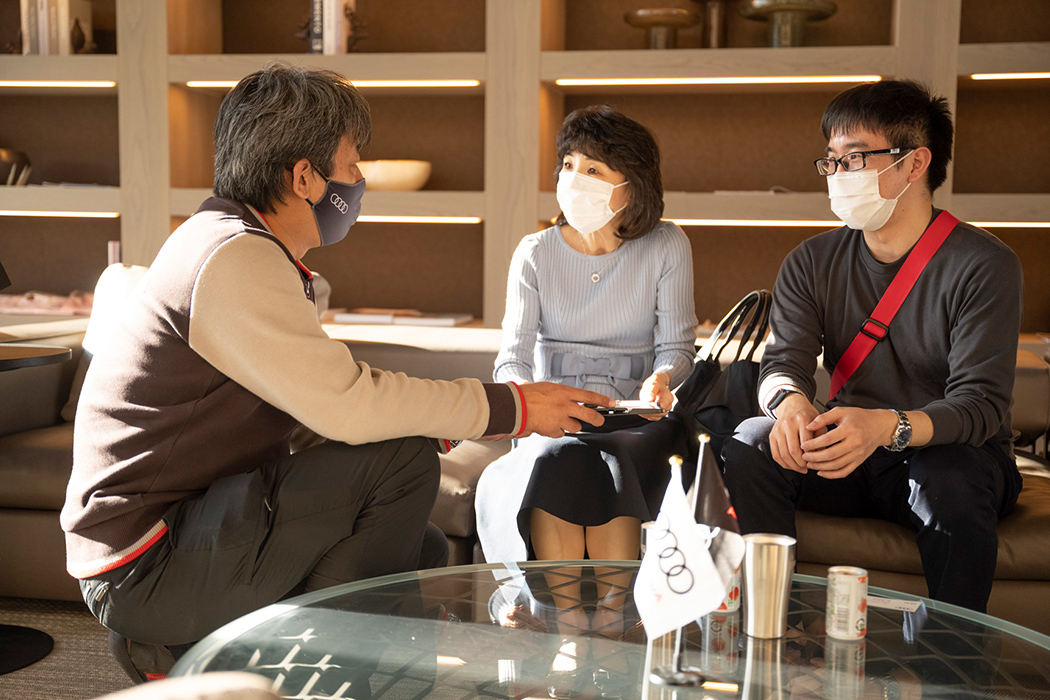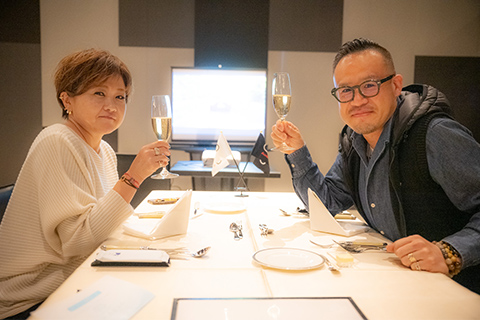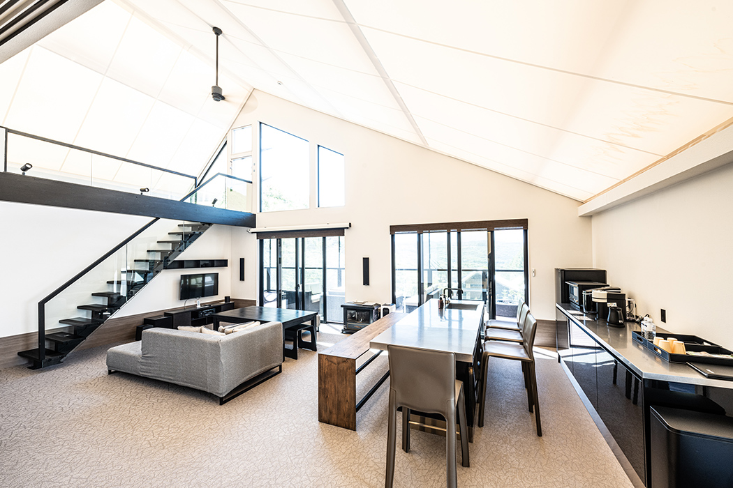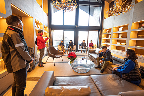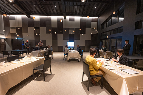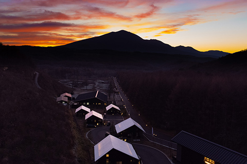 日が落ちると一気に寒気が押し寄せ、16棟のヴィラから漏れる光がいっそう温かく感じられます。夕食の会場は、ひときわ明るく輝く「天空柁(ダ)イニング」。弊社オペレーション本部ダイレクターの遠藤昭久による開会挨拶の後は、高原食材を贅沢に使ったスペシャルコースが供されました。この施設全体をプロデュースしたのは、世界的なデザイナーであるコシノジュンコ氏です。高い天井や借景を生かす大きな窓、さりげなく配置されたインテリアからは、自然と共生する姿が感じられます。車関連の雑誌がずらりと並べられたラウンジは、車を愛する同好の士が集うのに相応しい居心地の良さでした。