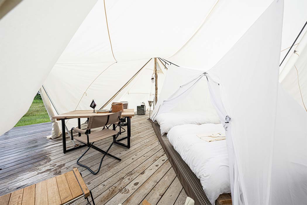標高1200mの北尾根高原にオープンした「Snow Peak FIELD SUITE HAKUBA KITAONE KOGEN」は、北アルプスの雄大な景色に抱かれて極上グランピングを楽しめるアウトドア宿泊施設です。お客様1組に1張の広々したテント内にはベッド、テーブル&チェアが据えられ、ミニバーやコーヒーセット、洗面シンクにWi-Fiまで完備された、まさに大自然の中のスイートルームでゆったりと寛いでいただけます。