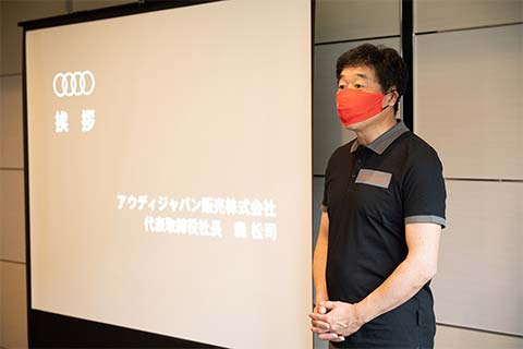 初日の正午。外は生憎の雨ですが、弊社 代表取締役社長の森 松司が開会挨拶で宣言したように、こんなコンディションのときこそ「quattro日和」。濡れた路面で、Audiが誇るquattro(四輪駆動)の底力を試していただく絶好の機会です。