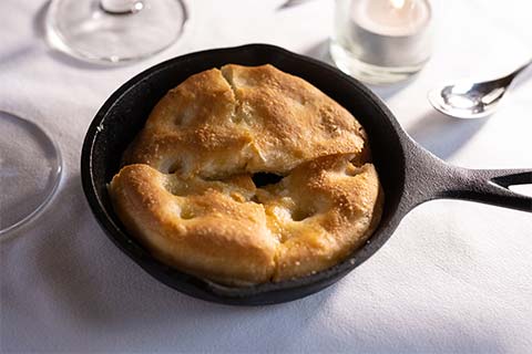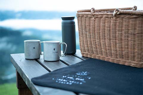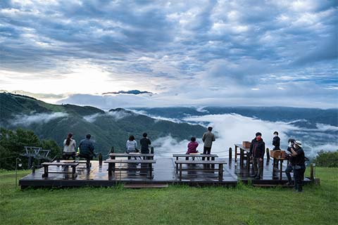 明け方4時。雲海の彼方から昇る日の出を拝む体験は、このグランピングならでは。朱に輝く白馬三山は、ご来光と呼ぶに相応しい神々しさです。朝食は各テントに運ばれ、滋味たっぷりのミネストローネスープや熱いスキレットに入った焼き立てパン、オムレツ、フルーツを召し上がっていただきました。