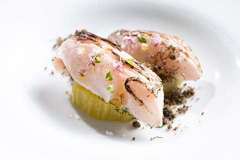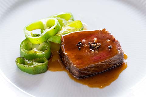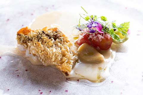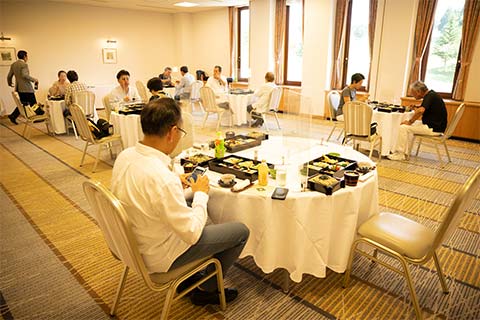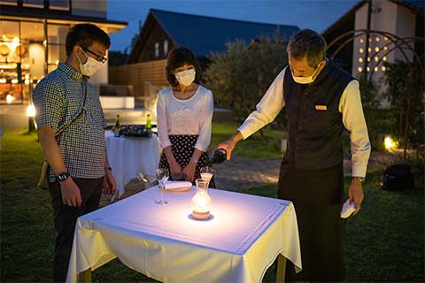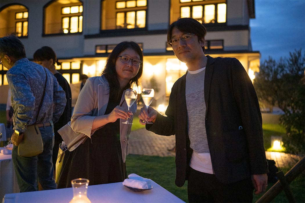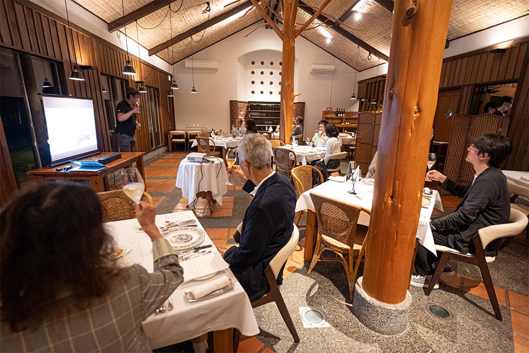 夕食は、ぶどう畑を見晴らす前庭での乾杯から始まりました。すっかり日が暮れ、涼しい風が渡る庭にグラスや食器の触れ合う音、談笑のざわめきが満ちていきます。コース料理は、併設されたレストランで供されました。至福の時間を演出するのは、日本海間瀬漁港から揚がる魚介、近隣の農家で穫れる野菜や果物、越後牛など、いずれも山海の幸に恵まれた新潟を堪能できるひと皿です。炙ったのどぐろとなす、ぶどうの葉で包み焼きした鮎、甘鯛とベルモットソースなど、食材やソースの組み合わせがどれもハッとするほど鮮烈で舌を喜ばせてくれます。ワインはもちろん、すべてカーブドッチワイン。例えば鮎にはあえて白ではなく赤ワインを合わせ、鮎の苦味とカベルネ・ソーヴィニヨンの濃厚な力強さのマリアージュを楽しむなど、新しい扉が開くような体験ができました。用意された6種類のワインをチェックアウト前に購入される方もいて、食事とホスピタリティは今回のツアーの白眉になったようです。
