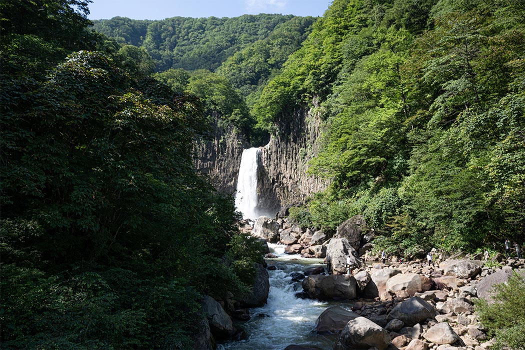 Royal Hotel長野に集合した5組10名の皆様はここから6台の試乗車に分乗し、一路、新潟を目指します。初日は、日本海に出て海沿いを北上するルートを選びました。途中で休憩を兼ね、日本百選に選出されている苗名滝に立ち寄ります。樹々の香りに包まれながらゴツゴツした岩場を15分ほど登っていくと、落差55mの瀑布が現れます。思わず歓声が上がる堂々たる姿は、一見の価値有りでした。