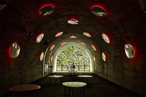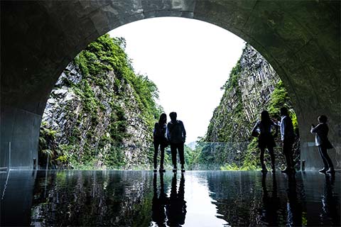 “映える”ポイントはまだあります。黒部、大杉谷と並ぶ日本三大峡谷の一つ、清津峡の渓谷トンネルは2018年に「大地の芸術祭作品」としてリニューアルされています。全長750mのトンネル全体が現代アート作品であり、とくに最終地点のパノラマステーションは水盤が鏡となって外の景色を映し出し、沢水に足を浸しながら風景に溶け込む幻想的な体験が人気のスポットです。ゆっくりと見物をし、体を伸ばして再び車へ。「あてま高原リゾート ベルナティオ」で昼食をとった後は、スタート地点のRoyal Hotel 長野を目指します。