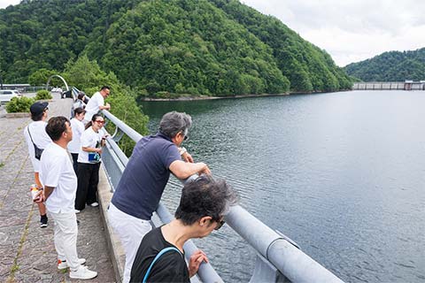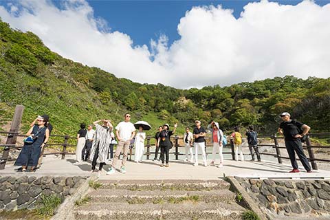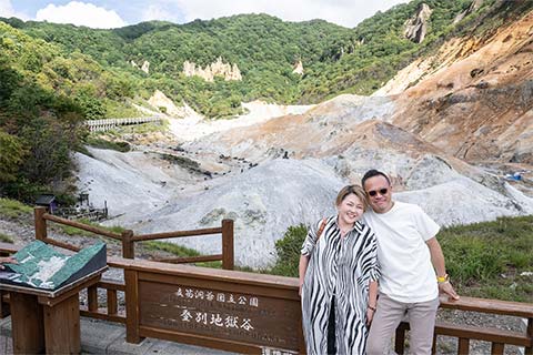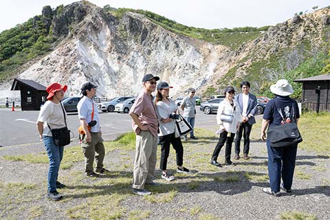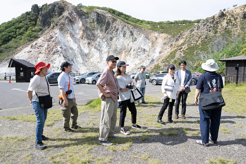 1つ目の目的地は、ランチ会場の「ホテルニドム」。500万㎡の大自然の中に佇む「ホテルニドム」で北海道の素材を贅沢に使用した和会席のコースをお召し上がりいただきました。ランチの後は、直径約450m、面積約11haの噴火活動による爆裂火口跡で、泡を立ててグツグツと煮えたぎった温泉と湯煙が名前の由来になった「登別地獄谷」と日和山の水蒸気爆発によって形成された「大湯沼」に立ち寄り、皆様にはガイドから生態系や水質などについての説明を聞いていただきました。