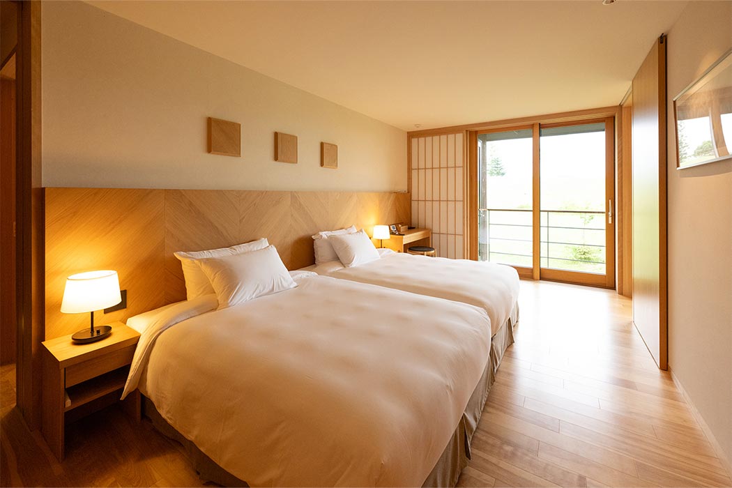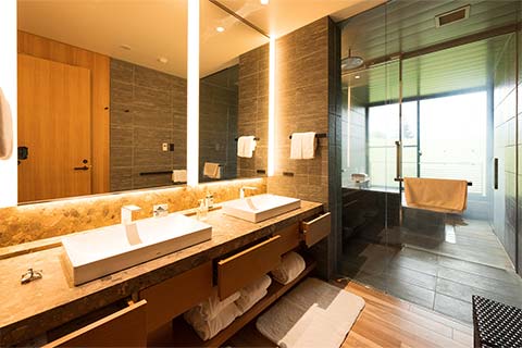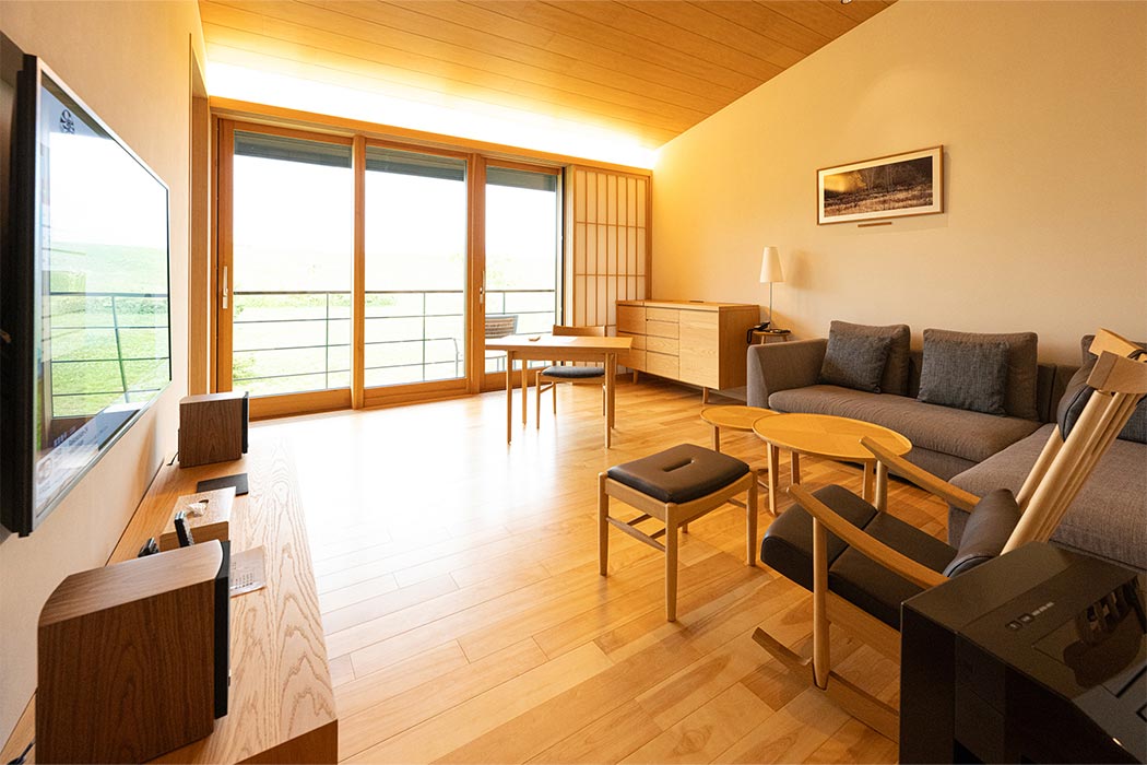お部屋は北海道産の木々と漆喰の壁で落ち着きのある空間で、羊蹄山をながめながら源泉かけ流しの温泉を完備しており、雄大な山を望みながら疲れを癒しいただきました。