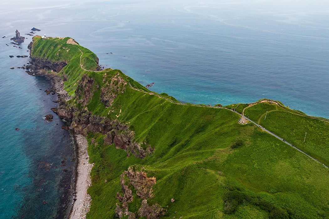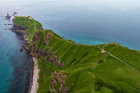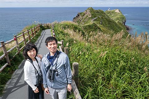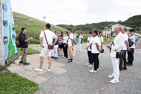 2日目最初の目的地は、「積丹ブルー」と呼ばれる積丹町の真っ青な海を一望することができる「神威岬」。ガイドの案内で珍しい花々や灯台についての説明を聞きつつ、岬の先端や海が見える「女人禁制の門」まで散策しました。天候に恵まれ、綺麗な空と真っ青な美しい海を皆様にご覧いただけました。