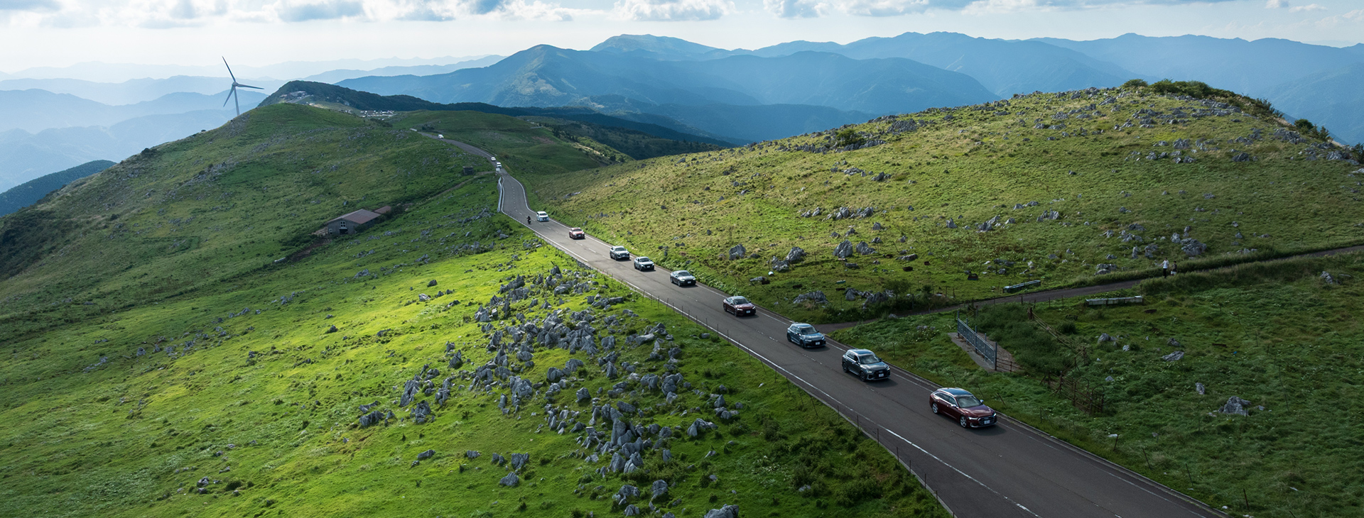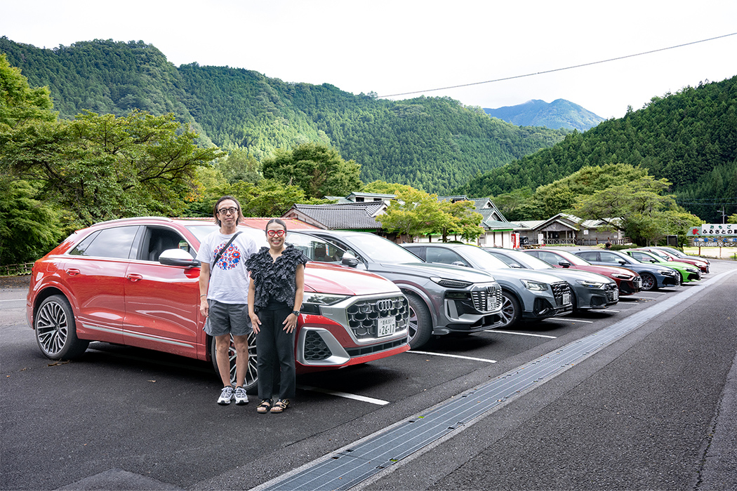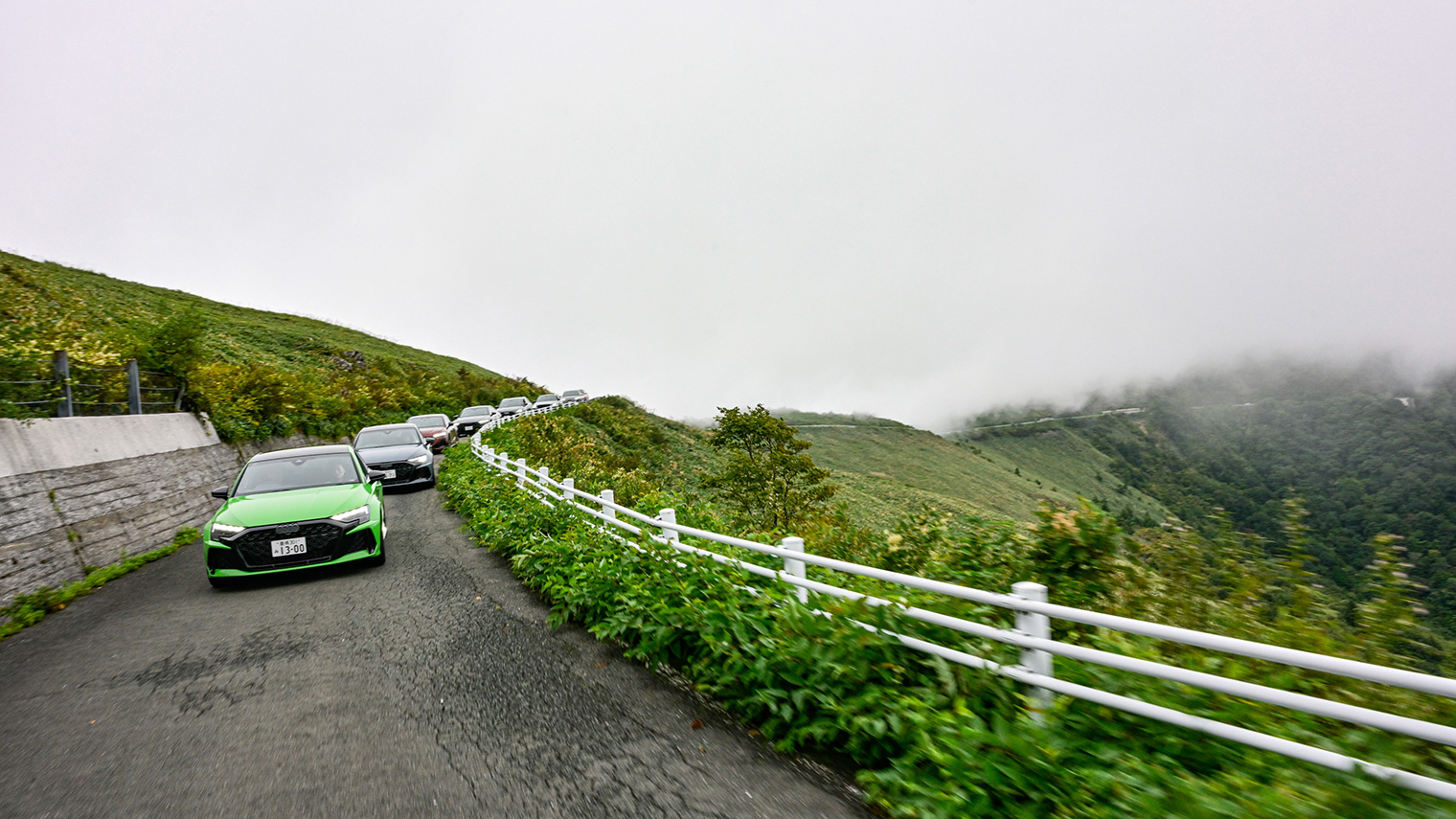 名越屋沈下橋を渡ると、徐々にコーナーが増えていき、いよいよAudiが誇る4WDシステム「quattro」の本領が発揮されるワインディングロードに入りました。標高約1,300mから1,700mの稜線が天空へと続くと言われている絶景のドライブコースとして有名な「UFOライン」を超えた先、石鎚山の登山口にある土小屋terraceを目指します。UFOラインまでの道には多くのヘアピンカーブがありましたが、全車種に一律のシステムを搭載するのではなく、車種ごとにセッティングが最適化された「quattro」による安定したコーナリング性能を存分に体感していただきました。